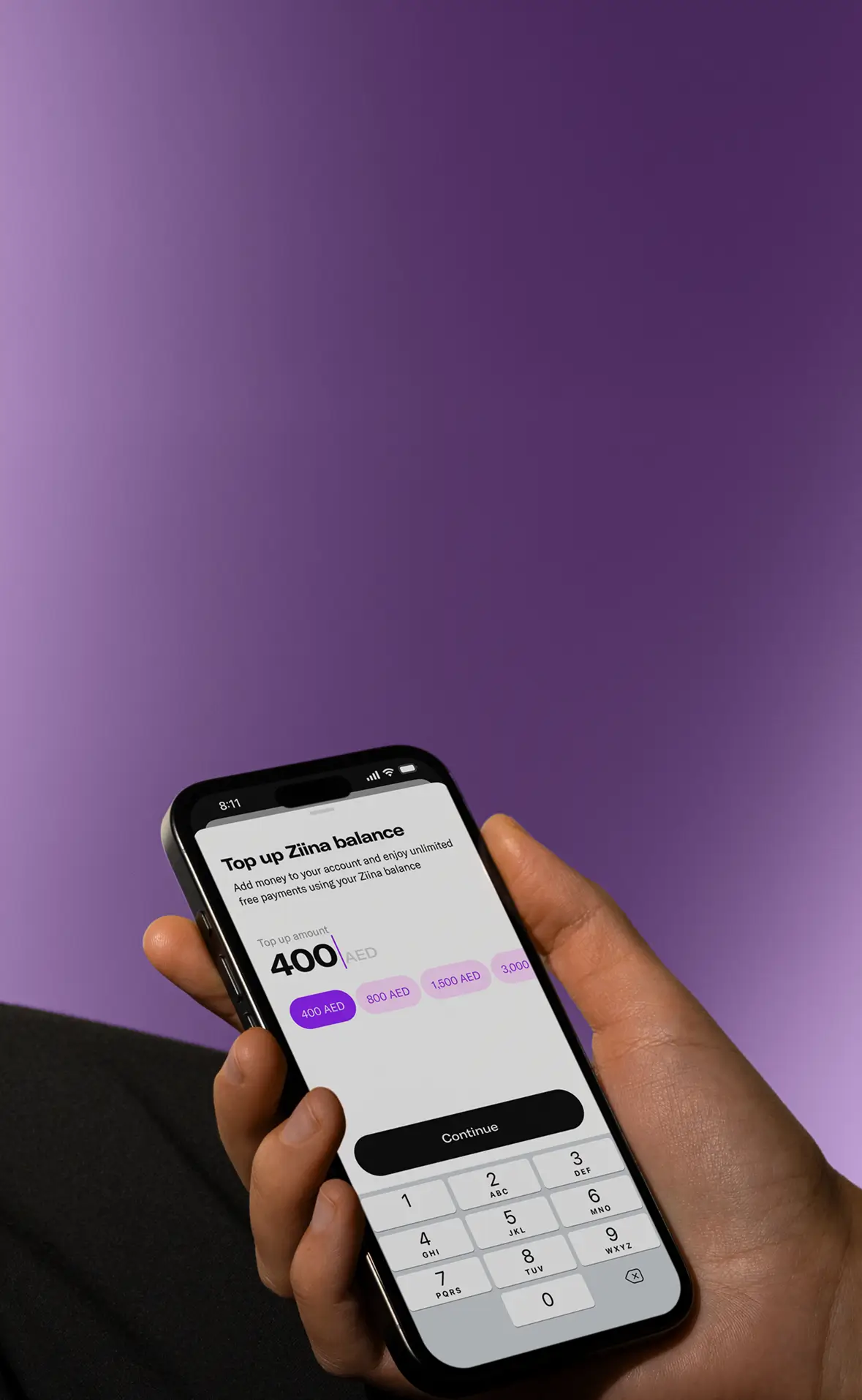 Add money to your account and enjoy unlimited free payments using your Ziina balance
